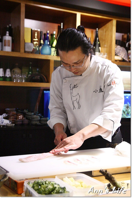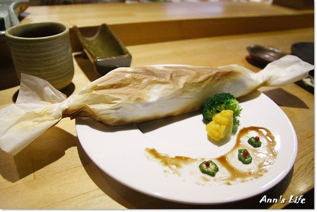 我們被安排在由整塊檜木切割製成的板前,享用一人$5,000的套餐,這應該是我目前為止吃過最高單價的料理,期待度很高,磯勢每週三次會從日本豐洲市場限時空運來台當令時節的食材,所謂的「不時不食」,指的就是吃東西要講究季節和時令。而坐在板前的好處,就是可以看到由日籍料理長伊藤一丸帶領的其他幾位師傅細緻而警慎的完成一道一道精緻料理的過程,專注而有條不紊。