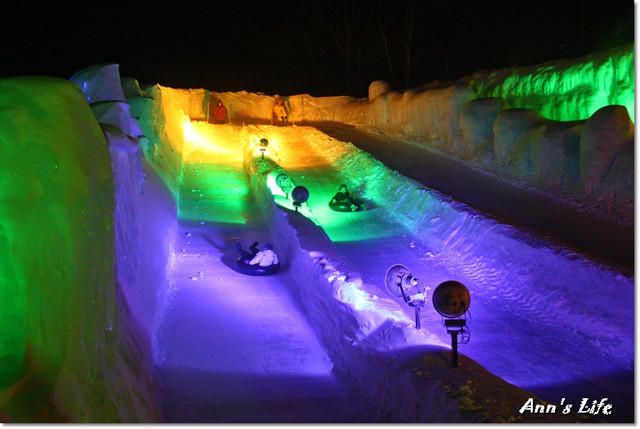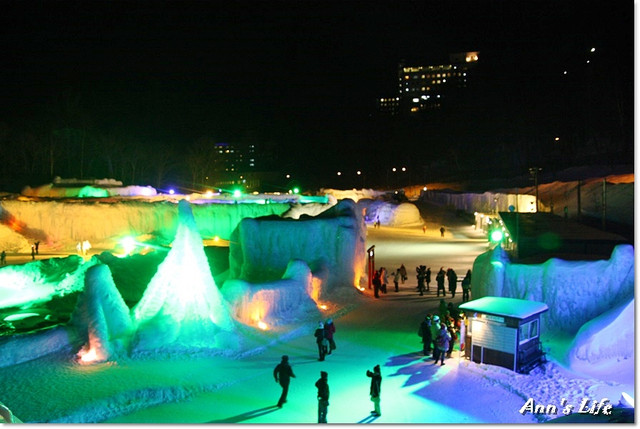 透過夜晚燈光變幻形成目眩神迷的冰的世界,只是冰塊易滑,走在這裡可說是舉步維艱,