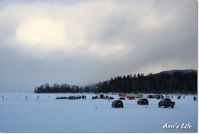 而二月底的季節,然別湖當然只覆上了一層厚厚的白雪,有趣的是遠方那一個一個的小屋子,