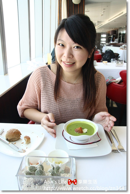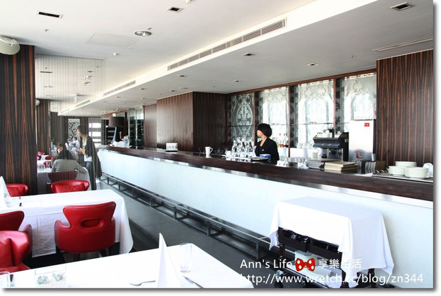 中午的頂餐廳一片明亮白色搭配熱情紅色皮椅,J一坐下就驚呼這椅子真舒適,加上椅背靠墊確實能令人放鬆癱軟。