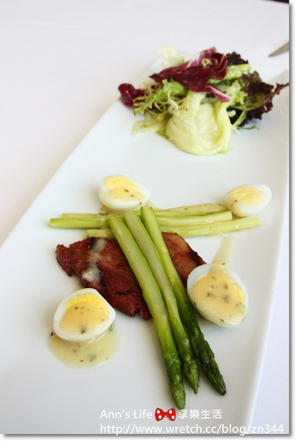 前菜培根鷓鴣蛋沙拉佐香芥醋汁這道無法選擇的前菜真是太絕,幾樣食材擺在一起很難聯想到昂貴,