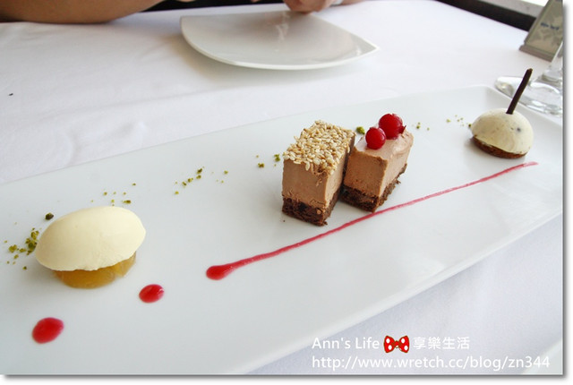 飯後甜點為主廚特製甜點,食用順序由左至右為百香果帕妃、巧克力慕絲、義式水果蛋糕,
