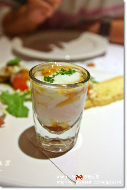 海膽溫泉蛋佐金桔果醋,半生不熟的溫泉蛋和金黃色的海膽融為一體,