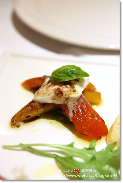 碳烤甜椒佐水牛嫩起司襯陳年黑醋汁,妙的是J一度以為上層的白色固體是魚肉,