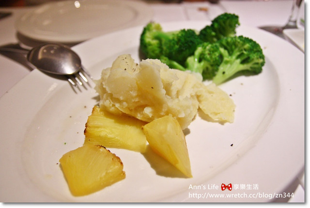 牛排附贈的副食,鳳梨、薯泥和花椰菜,不用說蔬食有去油解膩的效果,