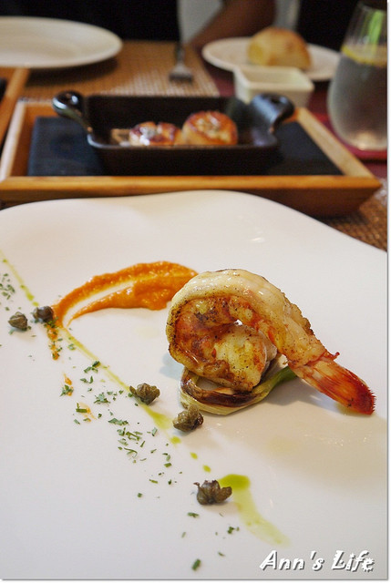 及西班牙鬥牛明蝦中捨魚選蝦和干貝,明蝦捲曲站立的擺盤姿態很好看,肉質亦非常Q彈結實有勁,