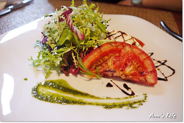 新鮮生菜中規中矩,沾取青醬別有風味,摩札瑞拉乳酪厚度和份量都十分豪氣,