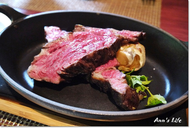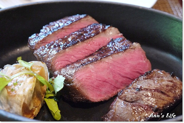 而我們吃的M5級紐約克油花分布均勻,切開來的色澤呈漂亮的粉紅色,不過或許是期待太高,