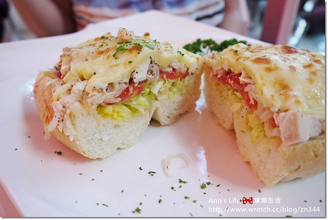 只是法國麵包太脆硬,我被分到的盤子剛好就半份三明治的大小,用刀叉切取吃得很狼狽,