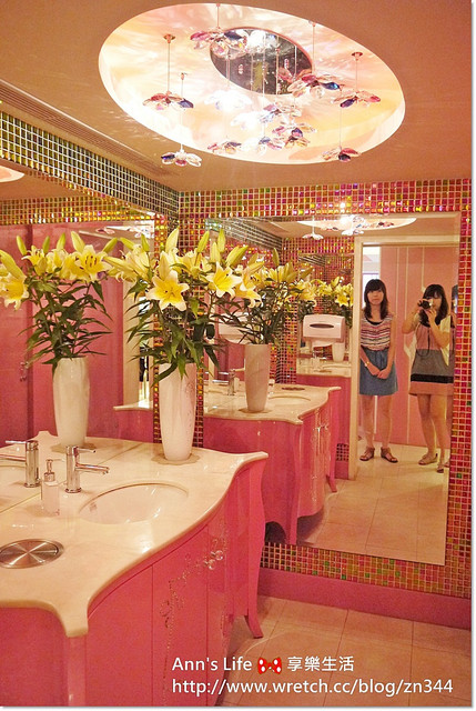 趕緊跑去參觀一下,雖然空間比我想像的小,但果然從牆壁到洗手台到門都粉紅到不行,