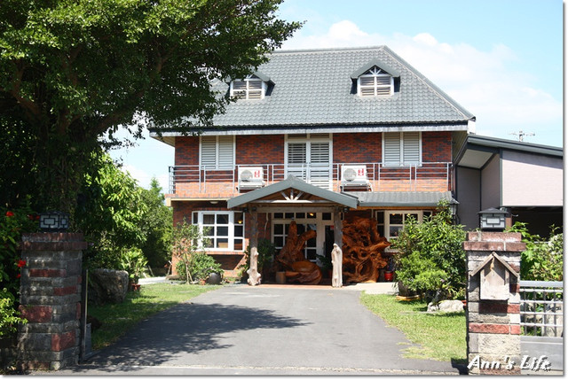 儘管差點迷路,最後還是在小巷裡找到自然合天,獨棟紅磚屋,門前有巨型檜木雕相當好認,