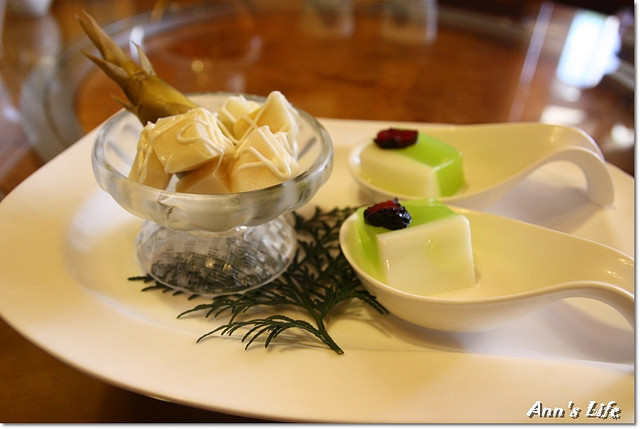 首道開胃菜是奇異果凍,上方用紫蘇梅點綴,淡淡的奇異果香清爽可口,咕溜一口就下肚了,