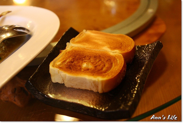 附上兩個烤得焦香的麵包,佐螃蟹襯底的醬汁很棒,麵包也很棒。