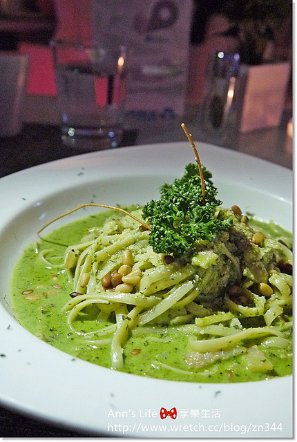 義大利麵或燉飯可以從菜單上的九道中選擇一樣,我們選了青醬松子培根細扁麵,J吃了一口就搖搖頭說:「不及格,麵太軟」,
