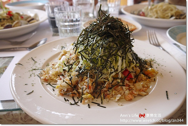 鋪上大量生菜絲和海苔的鮭魚炒飯是安媽的主食,對這道料理她可是讚譽有加,