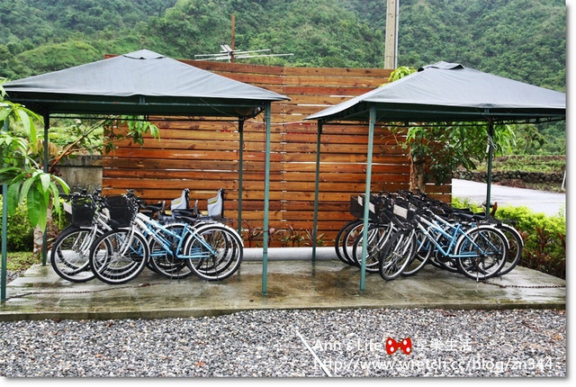 鋪得整齊的石子地和修剪過的草木造景,還架設了自行車的遮雨棚,仔細瞧瞧自行車車況都很新,
