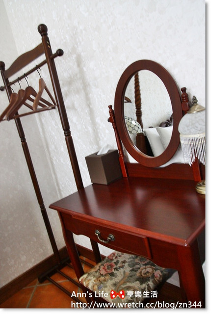 這裡沒有衣櫃,但衣架和梳妝台都和房間風格一致,