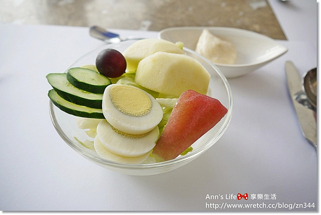 早餐的起頭是健康水果蔬菜沙拉佐特調金桔沙拉醬,金桔算是宜蘭名產之一,