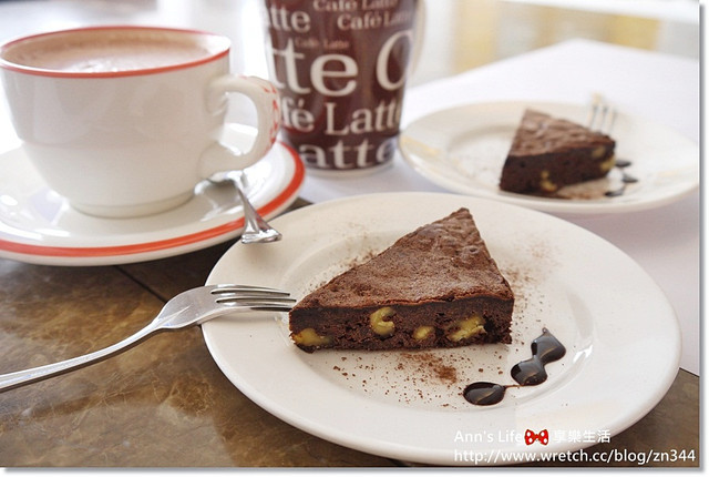 吳大哥加碼自家作的甜點布朗尼,然後我們又點了熱咖啡和熱可可牛奶來配,