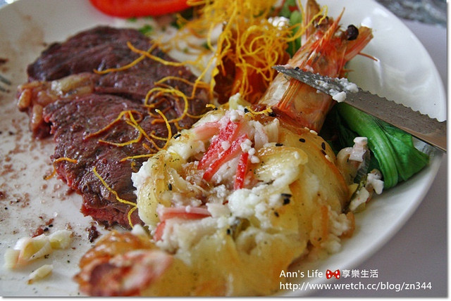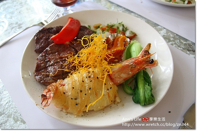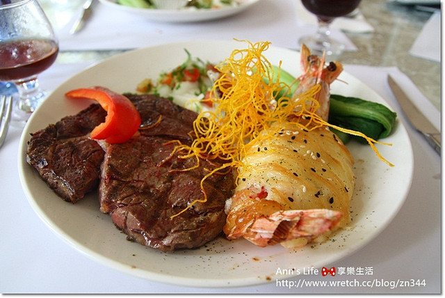 主角壽星的我當然要選比較澎派一點的主餐----上等沙朗&明蝦($650)海陸雙拼,