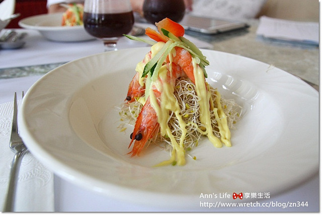 前菜以苜蓿芽鋪底,上方交疊著兩隻剝殼蝦,蝦肉沒有燙過熟,所以還保有鮮美彈性,