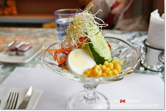 採用一人一套的西式早餐,先上清爽沙拉打頭陣,甜香的玉米和切片白煮蛋都是我的最愛,