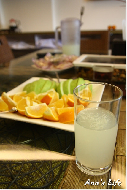看著洗淨切好的水果盤,其實剛吃飽午餐的我們一點都不餓,但沖泡好的冰涼檸檬汁很好喝,