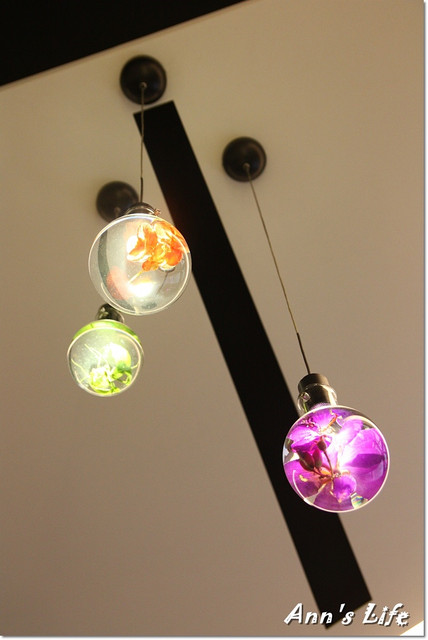 頭頂上的燈,是一個個生態玻璃球,裡頭長著紅豔花朵或是生氣盎然的綠植,
