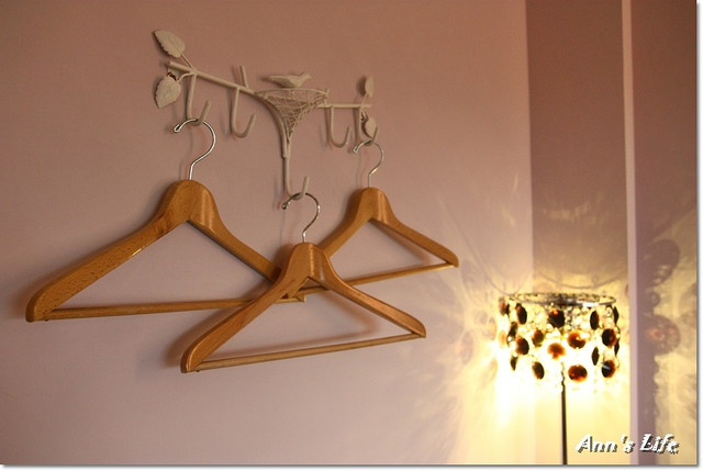 房內沒有衣櫃,簡單在牆壁上掛了幾個衣架,可以吊外套也就夠了。