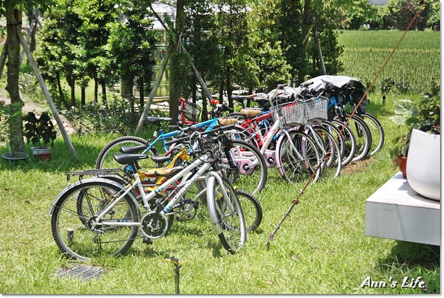 紫色小屋前架置了房客可免費使用的自行車,瞧瞧這裡連自行車都五顏六色,晚上買完晚餐回來的時候,看見一家子凳上腳踏車就呼嘯而過,不曉得去哪溜搭了,迎著夏夜晚風騎著自行車在宜蘭鄉間小路上漫遊,那種暢快愜意肯定是緩慢旅行的最好方式之一。