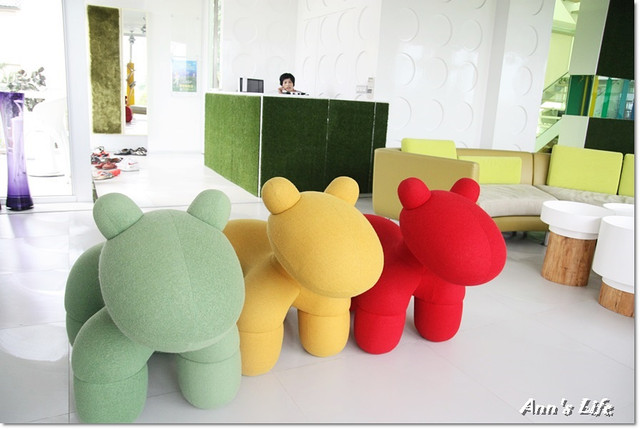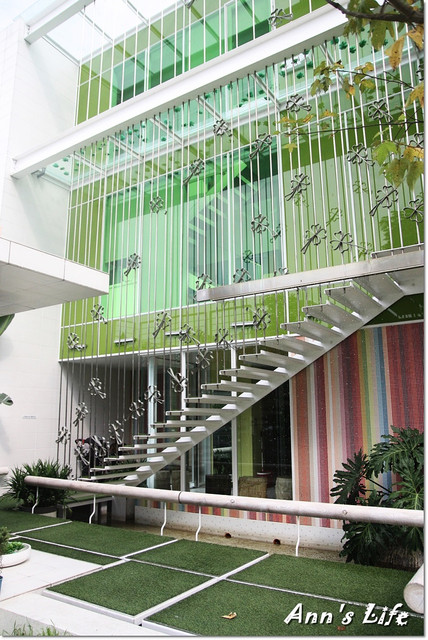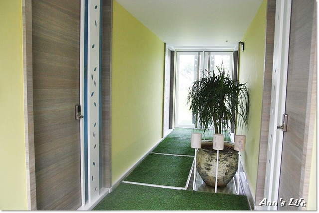 人造草皮延伸到一樓住房的走廊,這裡的四間房型分別為紅色熾熱雙人房、綠色相信雙人房、紫色奇幻雙人房和彩色彩虹四人房,之前已經參觀過,這回碰到假日滿房狀態,就沒再打擾了。