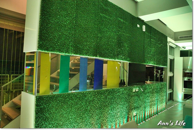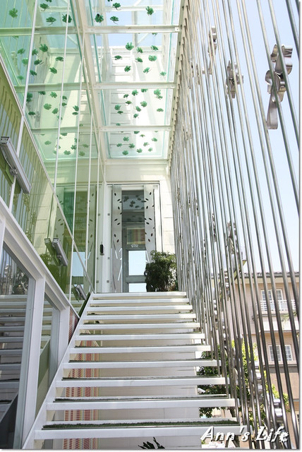 通往二樓的白色階梯同樣仔細的在每一階上都鋪上草皮,務求整體性連小細節處都不放過,由於頭頂上的玻璃透光,陽光照射水流波動的光影就這麼直接的打下來,伴隨著點綴的漂浮幸運草,彷彿走入一個天堂般的奇幻世界。