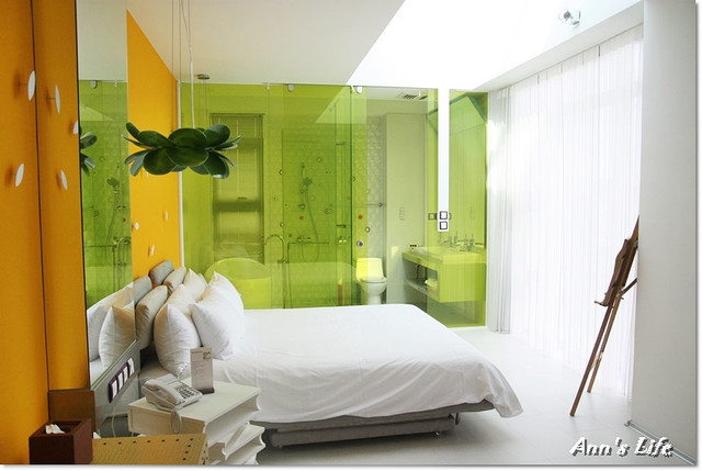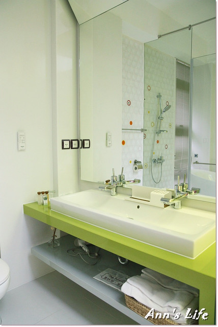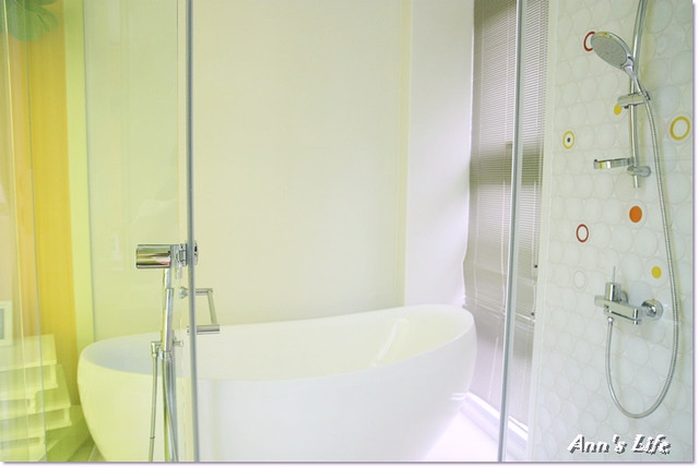 浴室和馬桶間有完整乾濕分離,在調色盤的每間房裡不僅寢具,就連衛浴設備也都各有變化,黃色房裡像雞蛋一樣的圓弧浴缸空間很大,我164cm身高坐在裏頭腿也可以整個伸直,淋浴的花灑很有趣,大的像個碗勺,可以依據身高調整高度十分人性化,不過因為使用的方式有些特別,可能常常會讓人弄得一頭霧水,所以智翔帶我們進房的時候還要先解說一下,否則自己摸索的話應該會耗半天XD