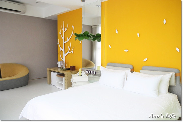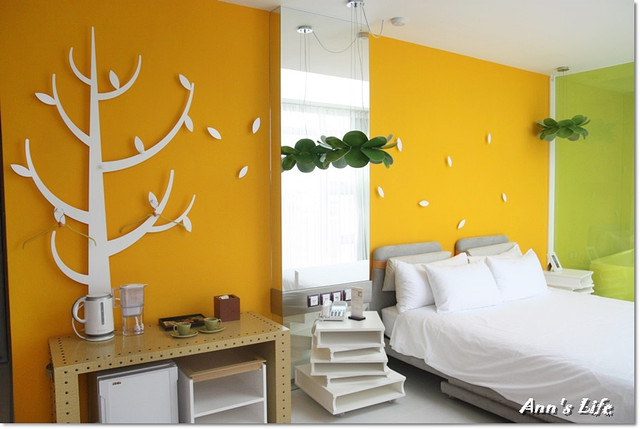 我覺得這間房帶有點童趣的味道,沒有衣櫃卻有樹幹造型的吊衣架,天花板垂下的葉片,竟然巧妙的帶來了照明,床頭櫃是不規則層層疊疊的書本,除了裝飾效果之外還兼具實用功效,讓想像力可以有更大的發揮,據說,這間房是從「大地」發想而來的,所以有樹有葉、有黃色、綠色、灰色、白色,有的全是帶來溫暖的顏色。