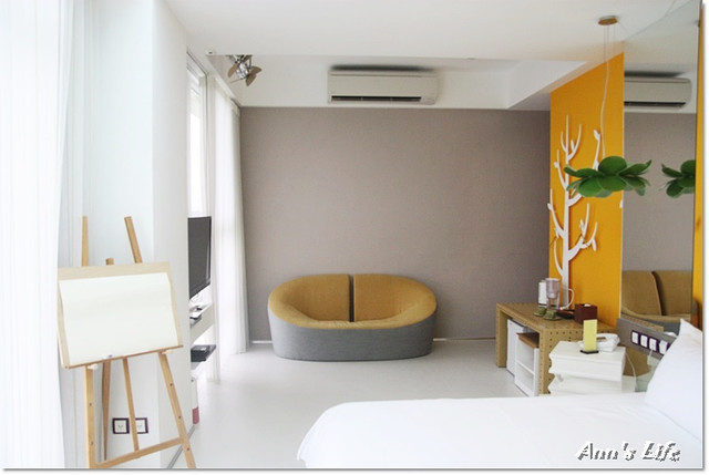 房內坪數已讓人滿意,可以說不會小的侷促、大的空洞,比一樓的精緻雙人房大上一些,卻又是剛剛好的溫馨,和房間配色很協調的移動式沙發,沒事的時候被用來堆行李,晚上就搬到電視前方,兩個人窩著看DVD啃晚餐,實在是平凡又愜意。