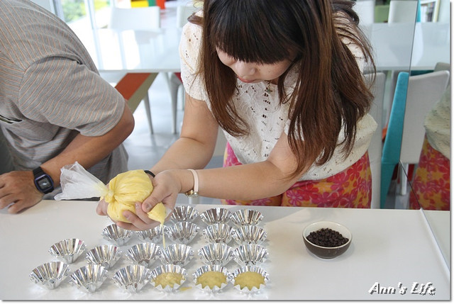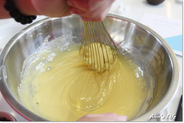 即便有發放彩色講義,但講師曉萍姐姐還是會按照步驟教學,並且觀察各組是否有碰到困難趕緊指正,在老師的教學下,完全會覺得做甜點好簡單,即使是笨手笨腳如我也可以變大師XD在我和J兩人分工合作之下(搶工?)輪流按照順序倒入原料、攪拌均勻,杯子蛋糕也終於完成雛型,緊接著就剩下盛裝和烘烤了。