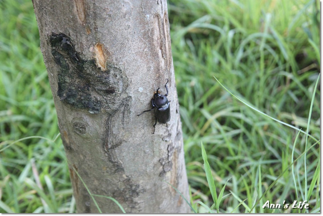 智翔發現我們跑到外面來溜搭,從二樓窗戶探了頭出來大喊,「小安,那邊的樹上有很多甲蟲喔!」我們才轉身搜尋,咦,真的耶!整棵樹上都爬滿了黑黑的甲蟲,我個人對昆蟲類是有點恐懼,不過也對大自然的生態感到景仰,J甚至以為是智翔把甲蟲給引進民宿裡,疏不知昆蟲就是會找到適合生存的地方安頓下來咧。