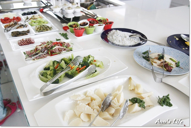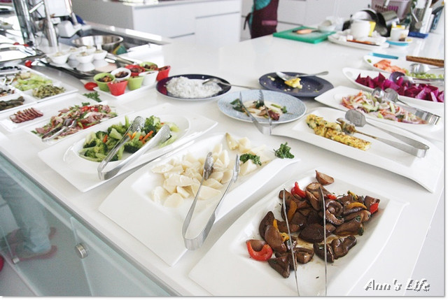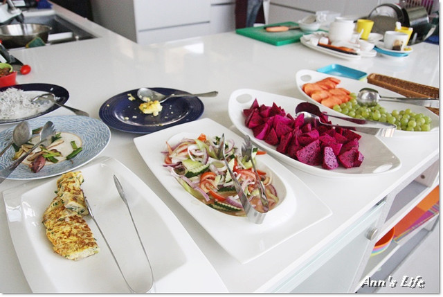 平日人少的時候應該是個人套餐的方式出餐,但假日人多供應的則是buffet,原來前一天教我們作檸檬巧克力蛋糕的曉萍姐姐也是早餐的大廚之一咧。