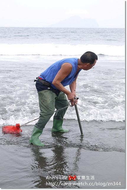 沙灘上看見一位大哥拖著一根長長的管子和紅色紗網,J很好奇他在做什麼,便大膽的上前詢問,