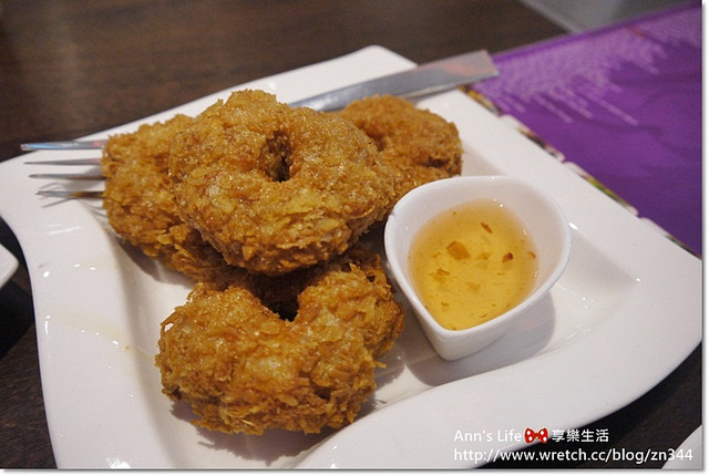 mango tree的炸蝦甜甜圈以蝦仁和魚漿油炸成金黃可口的甜甜圈造型,