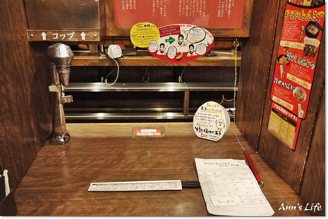 值得一提的是一蘭特別的個人卡座,一個蘿蔔一個坑,每個人都專注在自己眼前的拉麵上,有點像K書中心吧!除了因為這裡的拉麵評價很高之外,老實說想來吃一蘭有一部分的原因就是想體會一下購買食券和個人卡座的氣氛,果然讓我們這兩個觀光客感到非常新奇有趣!