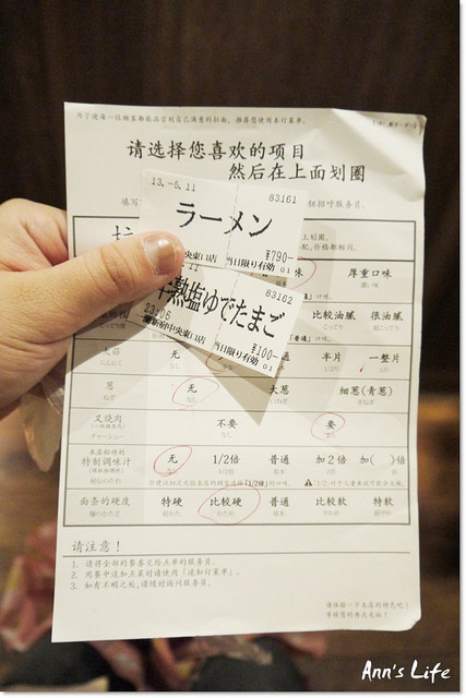 可能我們一臉看起來就不像本地人,正在盤算著要和店員要中文版的menu時,還沒開口他就直接遞給我們了,這裡的拉麵口味雖然只有一種,但是可以根據每個人喜歡的口味濃淡、麵條軟硬、湯頭清淡或油膩、以及要不要加蔥、叉燒或辣作客製化的調整。